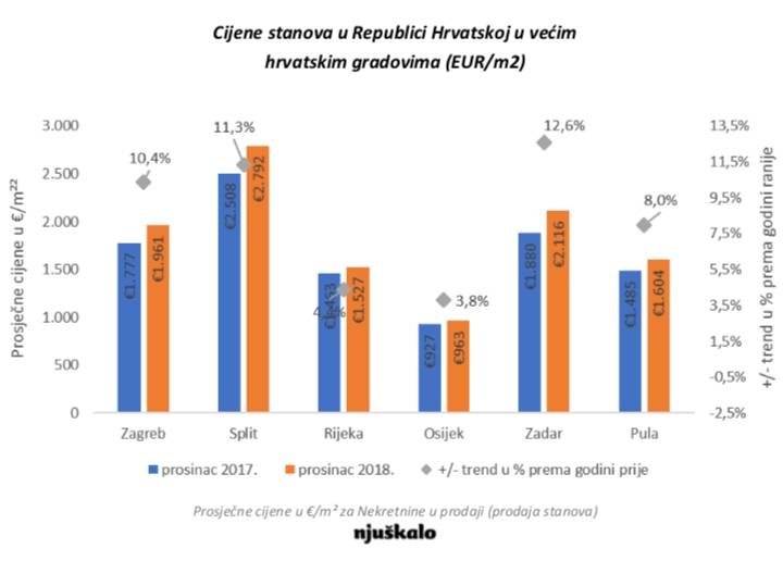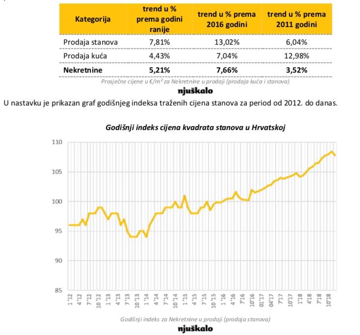 Godišnji rast cijena stanova u Zagrebu za 10 posto. Porast potražnje za nekretninama na Njuškalu Zagreb, 4. siječnja 2019. – Prema završnom, godišnjem, istraživanju Njuškala na uzorku većem od 150 tisuća nekretnina, iste su u 2018. godini bilježile srelovit rast. Cijene stanova u Republici Hrvatskoj prošle godine su rasle za gotovo 8 posto, dok su cijene kuća bilježile rast od 4 i pol posto. Pogledamo li posljednje dvije godine, 2017. i 2018., možemo uočiti da su cijene stanova rasle za čak 13 posto, dok je rast cijena kuća iznosio više od 7 posto.