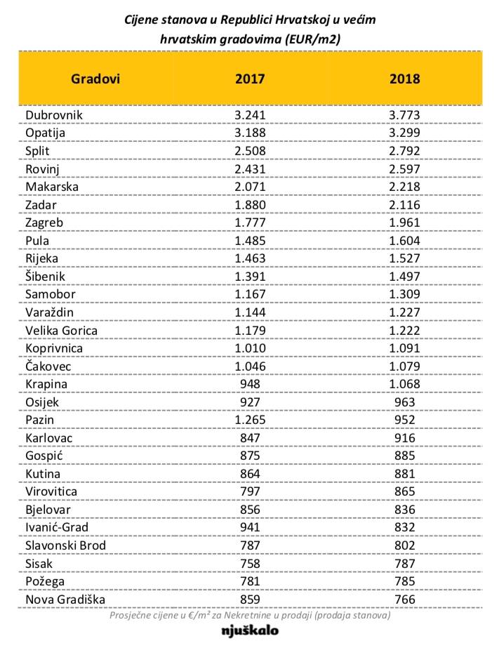 Najveći rast cijena stanova u prošloj godini zabilježen je u Dubrovniku, gdje prosječna tražena cijena iznosi 3.773 eura i viša je za preko 16 posto u odnosu na 2017. godinu. Visok godišnji rast cijena prisutan je i u Krapini. Tamo prosječna tražena cijena po kvadratu stana iznosi 1.068 eura, i za gotovo 13 posto je viša u odnosu na godinu prije. Generalno, možemo zaključiti da su cijene stanova najviše rasle u gradovima na obali, u Zagrebu i okolnim gradovima. U Samoboru su cijene stanova porasle za 12 psoto, dok je u Karlovcu taj skok nešto manje izražen, „tek“ 8 posto. Pogledamo li veće gradove na obali, u Splitu prosječna tražena cijena kvadrata stana iznosi 2.792 eura, što je više za 11 posto u odnosu na isti mjesec 2017. godine. U Zadru je rast cijena još izraženiji, gotovo 13 posto, te je u ovom trenutku prosječna tražena cijena kvadrata stana tamo 2.116 eura. Rijeka bilježi nešto manji skok, „tek“ 4 posto, i trenutno se prosječne cijene kvadrata stanova tamo kreću nešto više od 1.520 eura.