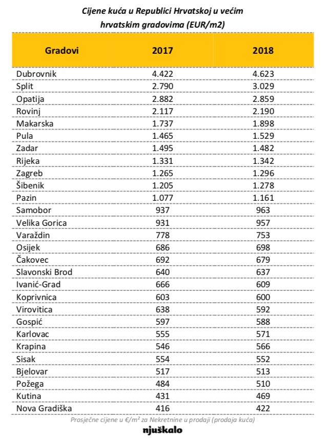 Dubrovnik je na uvjerljivom prvom mjestu kada pogledamo i prosječne cijene kvadrata kuća. Tamo ćete za kvadrat kuće s dvorištem u prosjeku morati izdvojiti 4.623 eura, što je za gotovo 5 posto više nego prije godinu dana. Na drugom mjestu po prosječnim cijenama kvadrata kuća nalazi se Split, gdje ćete za kvadrat kuće morati platiti prosječno 3.029 eura. Najpovoljnije cijene kuća su u gradovima na istoku Hrvatske, pa je tako u Požegi prosječna cijena kvadrata kuća 510 eura, dok je u Slavonskom Brodu ona 637 eura.