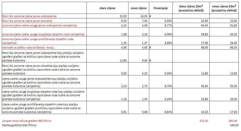 Stoga će od 1. svibnja građani dobivati veće račune za vodu u prosjeku od 160 kuna GODIŠNJE s tim da u ovu cijenu nije uračunat PDV. Dok će poslovni korisnici vodu plaćati nešto malo manje od 250 kn godišnje, također bez PDVa.