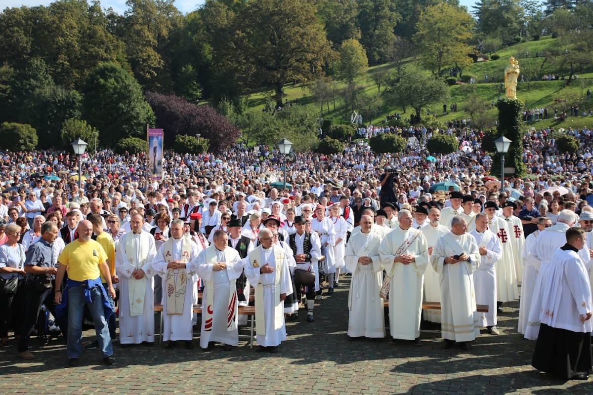 Na kraju su otpjevali pjesmu »Čuj nas, Majko«, a biskup Antun je u zaključnoj riječi izrazio radost što smo kao vjernici iz Požeške biskupije mogli danas u velikom broju biti u Mariji Bistrici na važnom duhovnom događaju. Istaknuo je da bi bez njih i njihova pobožnoga molitvenog i raspjevanog srca euharistijsko slavlje na kojem su sudjelovali bilo siromašnije, i obrnuto – da nisu na njem sudjelovali, oni bi ostali siromašniji. Poželio im je da duhovnu ispunjenost u srcima ponesu svojim kućama, te budu blagoslovljen hrvatski narod koji u svakodnevici zahvaljuje Bogu za darove kojima ih on obasiplje. Pobožnost je završila obilaskom hodočasnika oko Gospina lika, gdje su joj vjernici izrekli još svoje osobne molitve i zavjete.