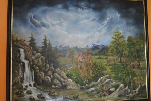 - Jedna od najdražih slika mi je ova - Adam i Eva u Edenskom vrtu iako mi je jedan čovjek rekao "Jesu li to Tarzan i Jane?". Oko u trokutu predstavlja Boga koji ih promatra u oblacima, ljudi to obično ne primijete jer gledaju prema dolje. Iza Adama i Eve je stablo života sa sva četiri godišnja doba. Zanimljivo je da su motivi većinom hrvatski. U pozadini je Velebit, s desne strane je Slavonija, a s lijeve Gorski kotar. Životinje su domaće poput jelena, medvjeda, vidri, sve je u paru. Jedino je zmija čudna, ona nije u paru.![]()