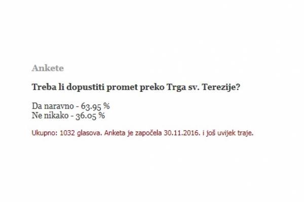 Od ukupno 1032 glasa prikupljenih u samo osam dana, 63,95posto građana je izrazilo mišljenje da Trg sv. Terezije treba ostati otvoren zamotorni promet, dok je 36,05 posto bilo da se promet zabrani. Građani su svojerekli, a koliko poštuju mišljenje građana na sjednici Gradskog vijeća poručilisu i vijećnici.