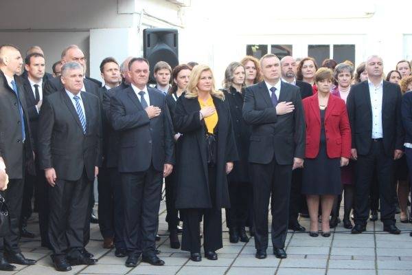 U dvorištu županije, pored Hrvatske i EU zastave podignutaje tako i ona ureda predsjednice Republike Hrvatske, a himnu je otpjevala AnaTicl, profesorica na Glazbenoj školi.