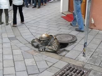 Razmišljavši o mukama maloga Ganimeda, iskorištenoga od strane grčkih Bogova naletio sam na simpatičnoga bezbrižnog „Čumila“. Ova najpopularnija od nekoliko zanimljivih umjetničkih instalacija u gradu jedini je svjetski kip koji izlazi iz šahte. Čumil je radnik koji proviruje iz šahta u samom gradskom središtu. Nije jasno što on točno radi ovdje na uglu Panske i Ribarske ulice: odmara se od napornog rada, gleda prolaznicama ispod suknji ili jednostavno zabušava u radno vrijeme. Što god to bilo ovo je najomiljeniji neobični spomenik. Na suprotnom uglu smjestio se egzotično obučeni djedica. Kao kakav Aladdin u jeseni života, ovaj starac zaokuplja pažnju prolaznika svojom levitirajućom pozom i šarenim kišobranom kojim ponosno dokazuje svoje moći. Stari performer je odlično prodavao trik kojim su Indijski Jogiji stotinama godina varali mase. Štap koji drži u ruci dio je postolja koji se prethodno instalira i na kojemu izvođač sjedi i u ovome slučaju polako ali sigurno skuplja sredstva za večerašnju najluđu noć u godini.
