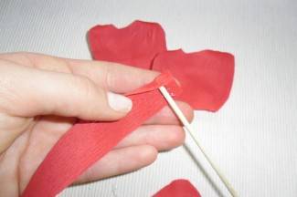 Na štapić nanesemo ljepilo pokraj krep papira (uske trake cca 30x2 cm). Zamatamo je tako da napravimo tučak ruže.