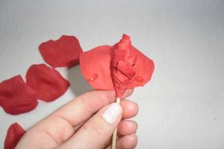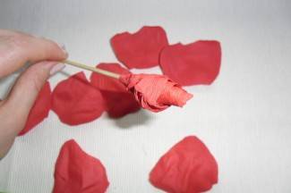 Kad je tučak gotov, na laticu nanosimo ljepilo prvo na sredinu, zalijepimo je pa tek zatim na krajeve latica. Ponavljamo dok ruža nije gotova. Broj latica koje stavljate ovisi o vlastitom ukusu, hoće li to biti rastvorena ruža ili zatvoreni pupoljci.