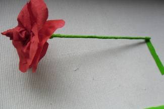 Krep papir zelene boje (30x0,5 cm) će nam poslužiti da omotamo štapić i od njega napravimo stabljiku. Ljepilo nanesite na štapić te ga omotajte papirom. Ukoliko želite praviti i listove, rade se na isti način kao i latice, samo što ga škarama oblikujete baš u list, a ne srcoliko.