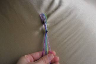 Uzela sam 4 gumene trakice i svezala u čvor. Radi lakšeg pletenja možete ih učvrstiti zihericom za hlače, tepih i sl., ili svezati oko noge stola, stupa itd. Umjesto trakica možete koristiti i vunu, konac za goblene i slično.