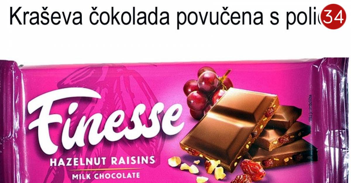 Ministarstvo poljoprivrede izvijestilo je da se Kraševa čokolada s lješnjacima i grožđicama Finesse od 80 grama, povlači iz prodaje zbog mogućeg sadržaja komadića stakla.