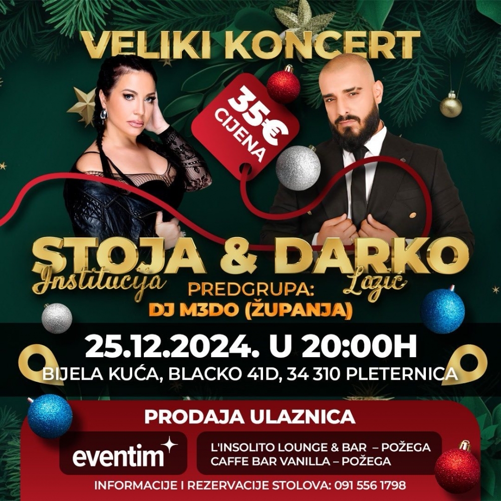 Pripremite se za glazbenu večer za pamćenje! U srijedu, 25. prosinca, u Bijeloj kući u Blacku, nedaleko Pleternice, održat će se veliki koncert na kojem će nastupiti dvije velike zvijezde: Stoja Institucija i Darko Lazić, izvođači dobro poznati na cijelom Balkanu i diljem Europe. Prije samih izvođača, publiku će za koncert zagrijati DJ M3DO iz Županje.