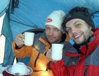 Igor Ivanović i Pavle Petrović nastoje se zagrijati toplim čajem u šatoru