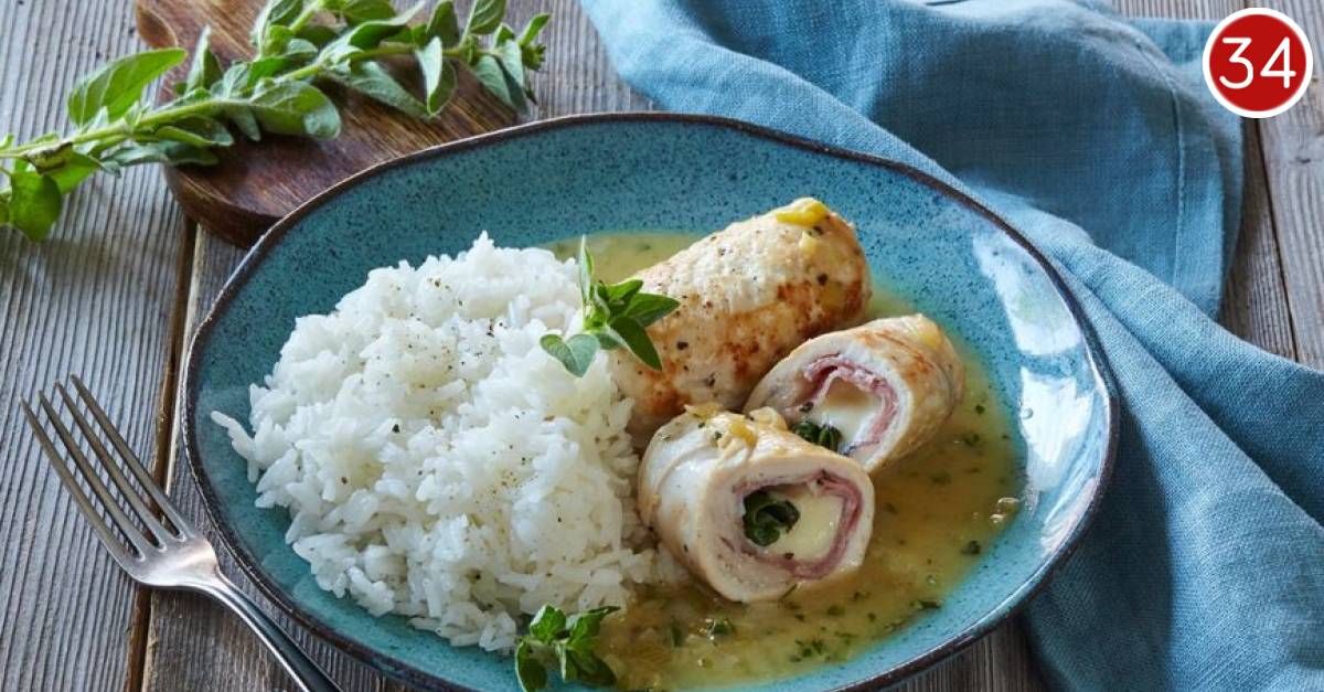 Očistite i prerežite pileća prsa po dužini kako biste dobili 4 jednaka dijela. Istucite piletinu batom za meso, začinite solju i paprom. Svaki komad piletine prekrijte jednom kriškom šunke s oko 25 grama mozzarelle, s nešto nasjeckanog zelenog dijela mladog luka i svježim origanom. Zarolajte piletinu u rolice i fiksirajte zamotuljke čačkalicom. Zagrijte u tavi biljno ulje te na njemu kratko zapecite rolice sa svake strane dok ne dobiju lijepu zlatno-smeđu boju. Premjestite rolice u lim za pečenje te ih termički obradite do kraja u prethodno zagrijanoj pećnici na 180 Celzijevih stupnjeva. Na tavi na kojoj ste pekli meso prepirjajte bijeli ostatak mladog luka.s maslacem. Podlijte ga bijelim vinom i kratko kuhajte dok se sve zajedno ne zgusne i ne dobijete umak. Začinite umak solju i paprom te svježe nasjeckanim origanom.Umak prelijte preko pečenih pilećih rolica te poslužite s kuhanom rižom. Dobar tek!