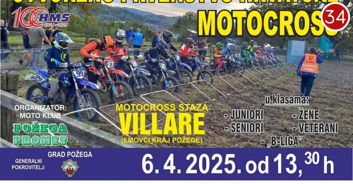 POŽEGA - Utrka Otvorenog prvenstva Hrvatske u motocrossu u organizaciji Moto kluba Požega Promet i pod pokroviteljstvom Grada Požege održat će se u nedjelju, 06. travnja 2025. godine na stazi Villare u Donjim Emovcima. Otvorenje utrke zakazano je za 13:15 sati, a start utrke za 13:30 sati.
