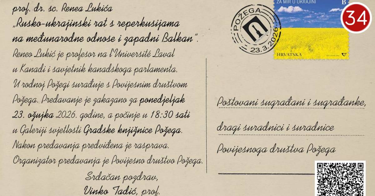 Povijesno društvo Požega organizira predavanje prof. dr. sc. Renea Lukića, renomiranog povjesničara i stručnjaka za međunarodne odnose, na temu „Rusko-ukrajinski rat s reperkusijama na međunarodne odnose i Zapadni Balkan“. Predavanje će se održati u ponedjeljak, 23. ožujka 2026. godine u 18:30 sati, u Galeriji svjetlosti Gradske knjižnice Požega.