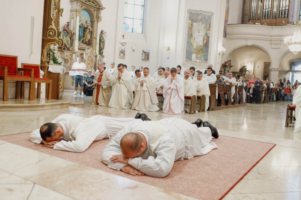 Nakon homilije kandidati su stupili pred biskupa, iskazali spremnost prihvatiti obveze vezane uz sveti red prezbiterata te mu obećali poštovanje i poslušnost. Biskup je zatim pozvao prisutne na molitvu Litanija svih svetih, a ređenici su činom prostracije ispred oltara iskazali potpuno predanje Bogu. Uslijedio je središnji čin ređenja – polaganje ruku na ređenike po kojem oni postaju uključeni u red svećenika Požeške biskupije i posvetna molitva. Ređenicima su potom odjenuli svećeničko ruho – misnicu i štolu, a zatim su pristupili biskupu koji im je pomazao dlanove svetom krizmom i predao im u ruke pliticu s kruhom te kalež s vinom i vodom za slavlje svete mise.