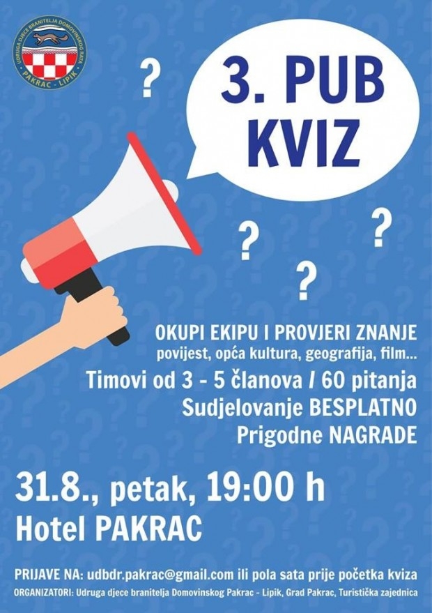 U organizaciji Udruge djece branitelja Domovinskog rata Pakrac – Lipik, Grada Pakraca i TZ Grada Pakraca u petak 31. kolovoza s početkom u 19:00 sati u Hotelu Pakrac će se održati 3. PUB kviz.