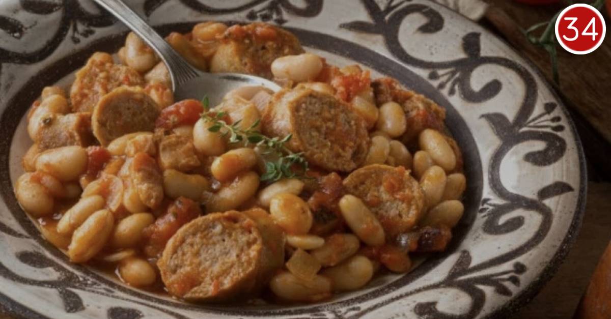 6 svježih kobasica za kuhanje, 200 g slanine, 2 glavice luka, 2 stabljike celera, 2 češnja češnjaka, 1 žlica dimljene paprike, ½ vezice majčine dušice, 200 ml bijelog vina, 400 g pelata, oko 300 ml pilećeg ili povrtnog temeljca, 400 g kuhanog graha (limenka), 400 g kuhanog bijelog graha (limenka), 1 žlica šećera, 1 žlica crnog vinskog octa