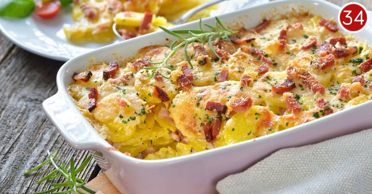 - U vatrostalnu posudu stavite tanak sloj umaka, na njega posložite krumpire, naribani sir i preprženu slaninu. Ponavljajte postupak dok ne potrošite sve sastojke.