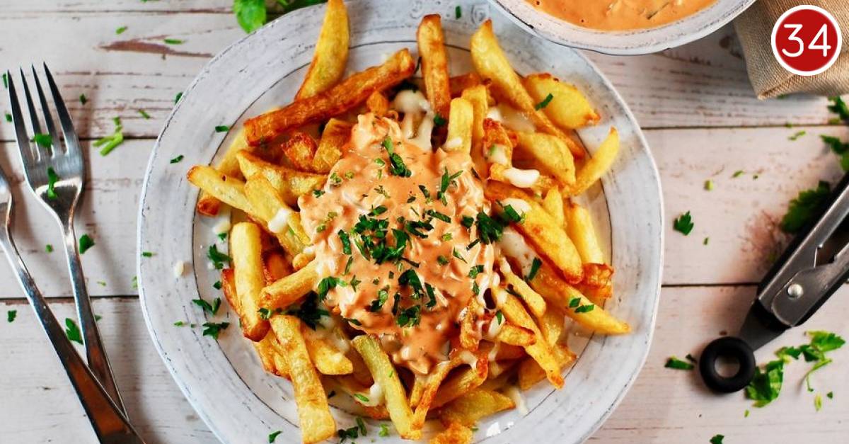 Na kraju dodajte malo ljutog umaka. Prelijte gotov umak preko prženih krumpirića i poslužite s nešto začinskog bilja po želji. Dobar tek!