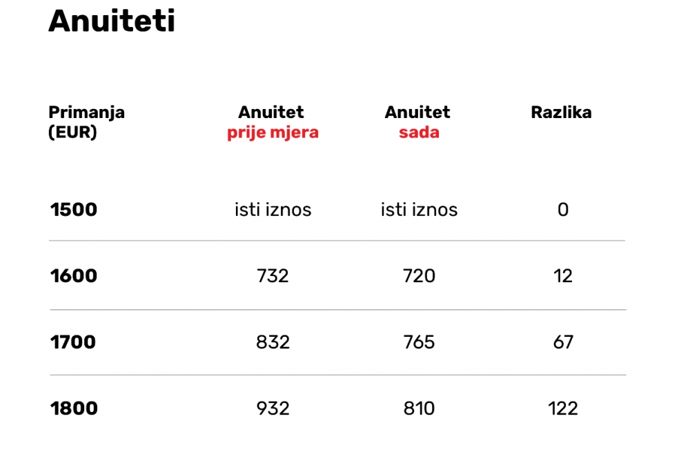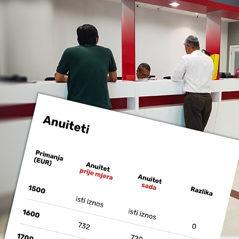 "Za primanja u visini 1.700 eura prije je anuitet mogao biti do 832 eura, a sada može biti do 765 eura. Na 1.800 eura anuitet je mogao biti do 932, a sada može biti do 810 eura. Kako se plaća povećava, tako je razlika sve veća", rekao nam je kreditni posrednik Srđan Grzunov.