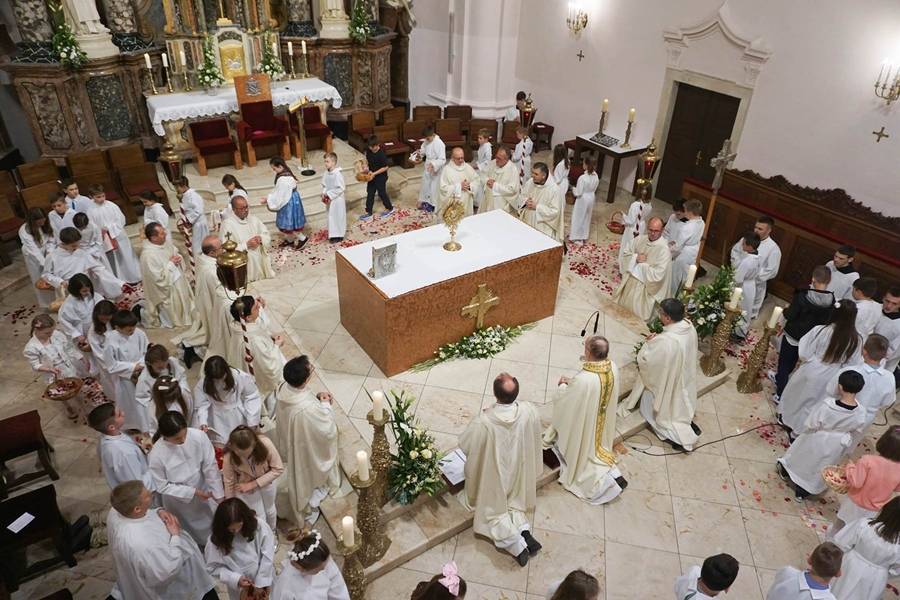 Na svetkovinu Presvetog Tijela i Krvi Kristove – Tijelovo, 11. lipnja požeški biskup Antun Škvorčević predvodio je euharistijsko slavlje u požeškoj Katedrali zajedno s kanonicima Stolnog kaptola, svećenicima gradskih župa te svećenicima iz središnjih biskupijskih ustanova. Na slavlju su sudjelovali brojni vjernici iz požeških župa: djeca vrtićke dobi, ovogodišnji prvopričesnici, ministranti, učenici katoličkih škola, mladi, članovi crkvenih udruga i molitvenih zajednica, a pridružili su im se predstavnici Hrvatske vojske i policije, kao i predstavnici gradskih udruga. Na početku misnog slavlja biskup Antun je pozdravio nazočne vjernike, podsjetivši da nas po presvetoj euharistiji prisutnoj dvije tisuće godina u Crkvi božanska snaga i danas okuplja, iznutra povezuje i čini dionicima Isusove muke, smrti i uskrsnuća. Pozvao je okupljene vjernike da nakon iskustva ugroze koronavirusom koje ih je udaljiilo jedne od drugih i od zajedničkih slavlja svete mise u crkvi ovim tjelovskim slavljem posvjedoče Isusu Kristu svoju blizinu i zahvalnost te mu iskažu javno štovanje.