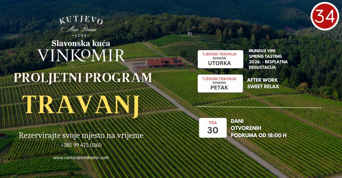 Proljeće u Kutjevu donosi poseban ugođaj, a travanj u restoranu Vinkomir rezerviran je za opuštanje uz vrhunska vina, pažljivo osmišljene programe i jedinstveni ambijent vinograda. S pogledom na zelene padine i uz bogatu eno-gastro ponudu, Vinkomir postaje idealno mjesto za bijeg od svakodnevice i uživanje u toplijim danima.