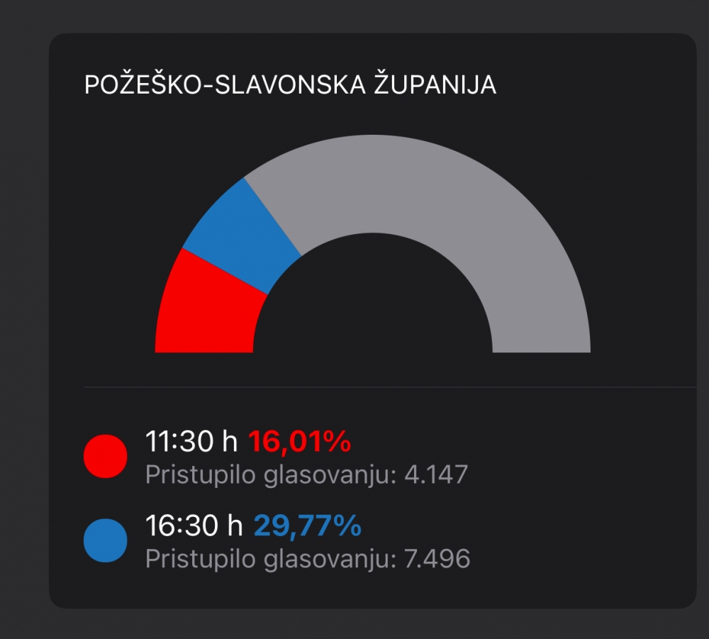 Prema najnovijim podacima o izlaznosti do 16:30 sati, Požeško-slavonska županija bilježi ukupnu izlaznost od 29,77%, s ukupno 7.496 birača koji su pristupili glasanju. U odnosu na prijepodnevne podatke u 11:30 sati, kada je izlaznost bila 16,01%, jasno je vidljiv rast interesa građana.