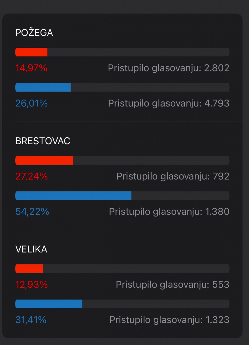 U Velikoj je zabilježena također relativno visoka izlaznost – 12,93% do 11:30, što se do 16:30 povećalo na značajniju brojku 31,43%. I ova općina pokazuje ozbiljnu mobilizaciju birača.