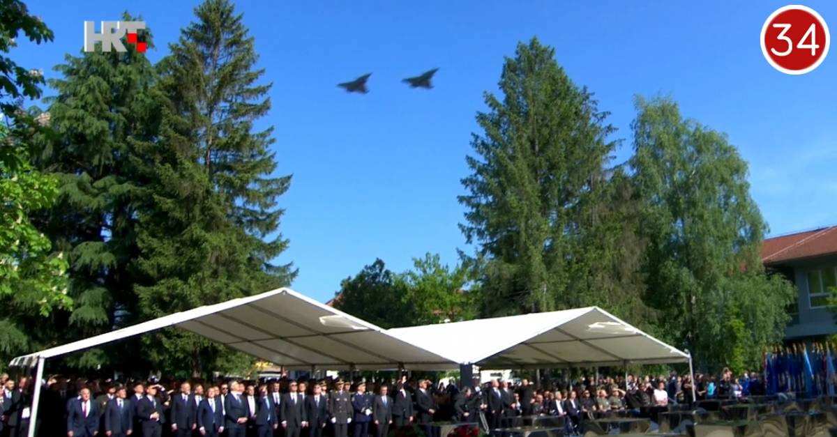 Nakon što su izaslanstva položila vijence kod spomen-obilježja "Kristalna kocka vedrine" - dva borbena aviona Rafale preletom su iznad Okučana odala su počast svim hrvatskim braniteljima koji su sudjelovali operaciji „Bljesak“.