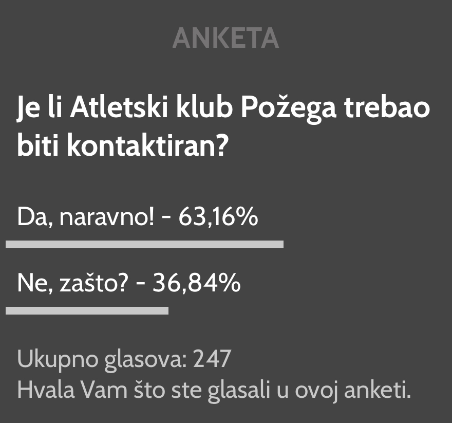 S pravom ili ne, u takvom slučaju može se reći da je sport i izgradnja atletskog stadiona u Požegi maksimalno ispolitizirana zarad PR-a i političkih bodova, a čija je izgradnja trebala i morala biti barem minimalno iskomunicirana s Atletskim klubom Požega, koliko god to gradonačelnik Glavić htio ili ne htio, a što dokazuju i rezultati naše današnje ankete u kojoj više od 60% čitatelja smatra da je lokalni atletski klub morao biti kontaktiran od strane investitora odnosno Grada prilikom ove ne male investicije.
